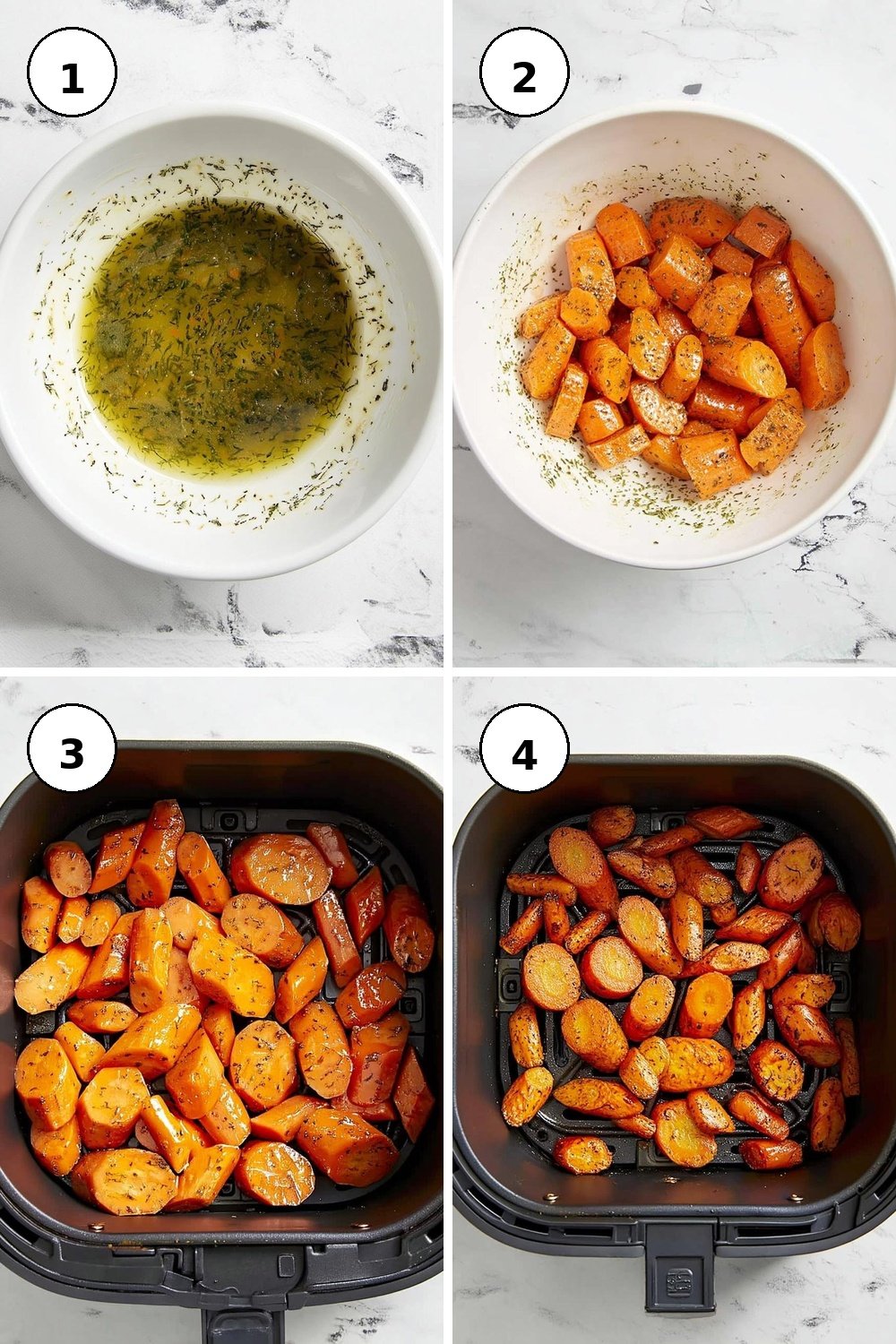 - Add seasoned carrots to the air fryer basket. Air fry at 370°F for 12-14 minutes until tender, shaking the basket halfway through. Once done garnish with fresh chopped dill.