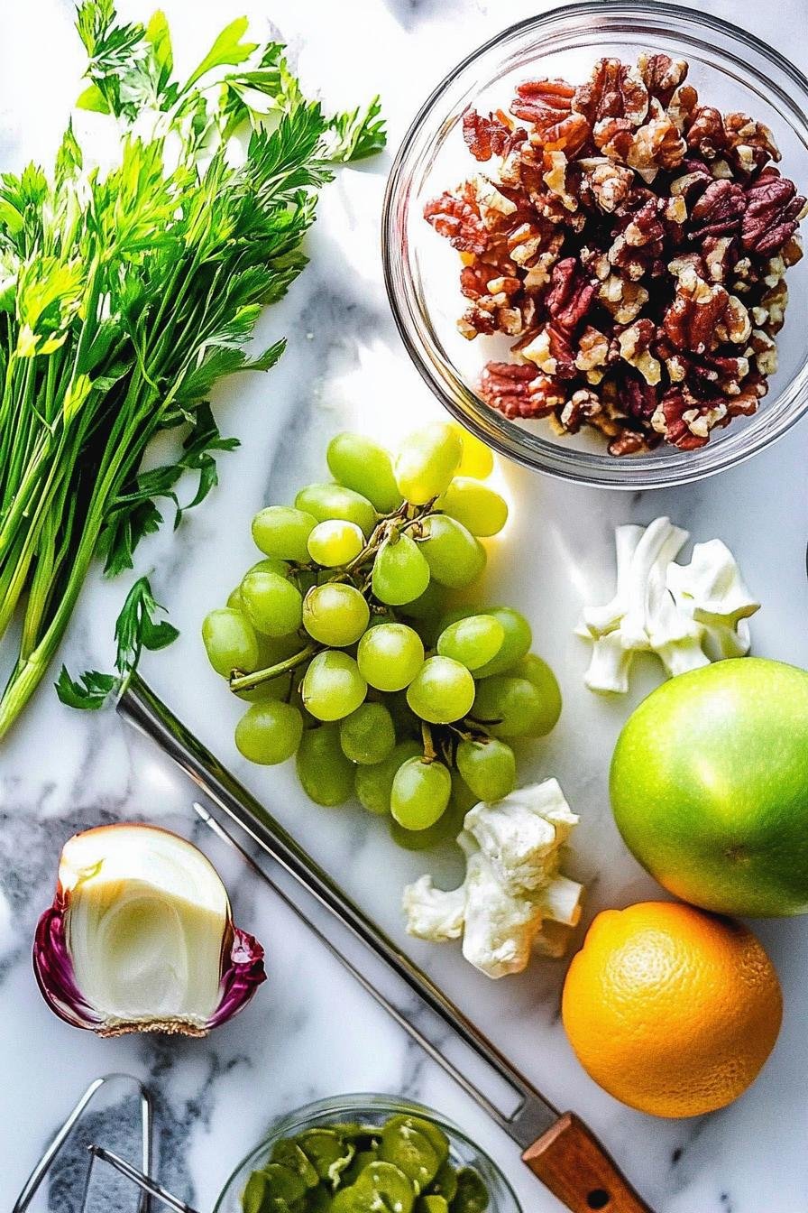- Core and dice 2 apples (leave the skin on for color), then toss immediately with 1 tablespoon extra lemon juice in a large bowl to halt browning; fold in 2 stalks celery, thinly sliced, and 1 cup seedless red grapes, halved.