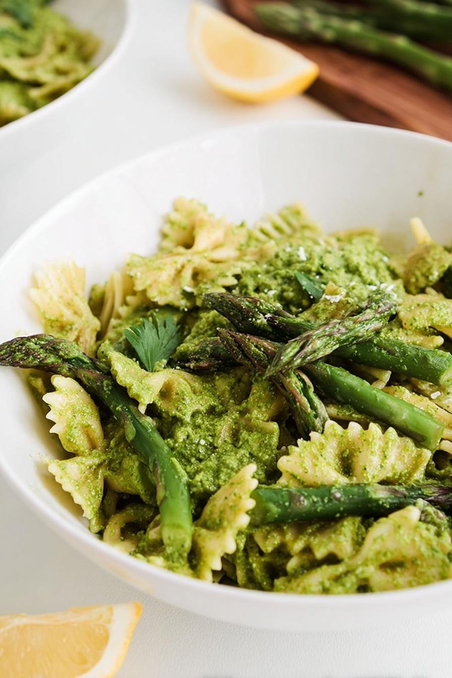 - Once the pasta is cooked, drain it and mix with the asparagus pesto, adding some reserved cooking water to create a silky sauce.