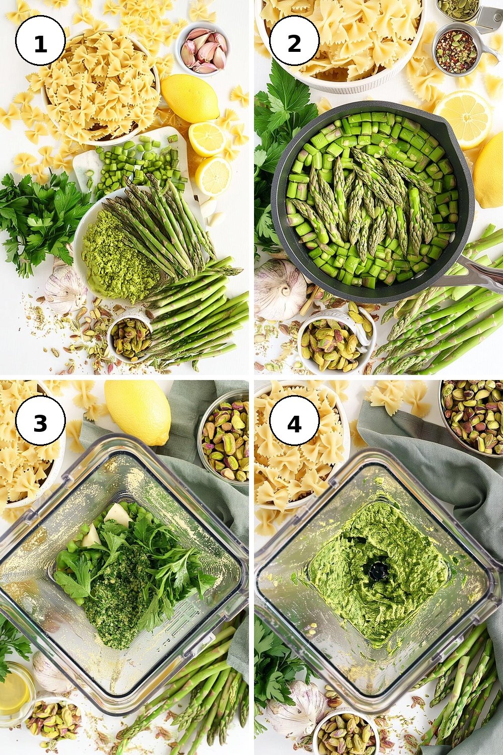 - Add the pistachios to a blender, then toss in the cooked asparagus, lemon juice, parsley, olive oil, salt, and pepper. Blend until smooth, adjusting seasoning as needed.