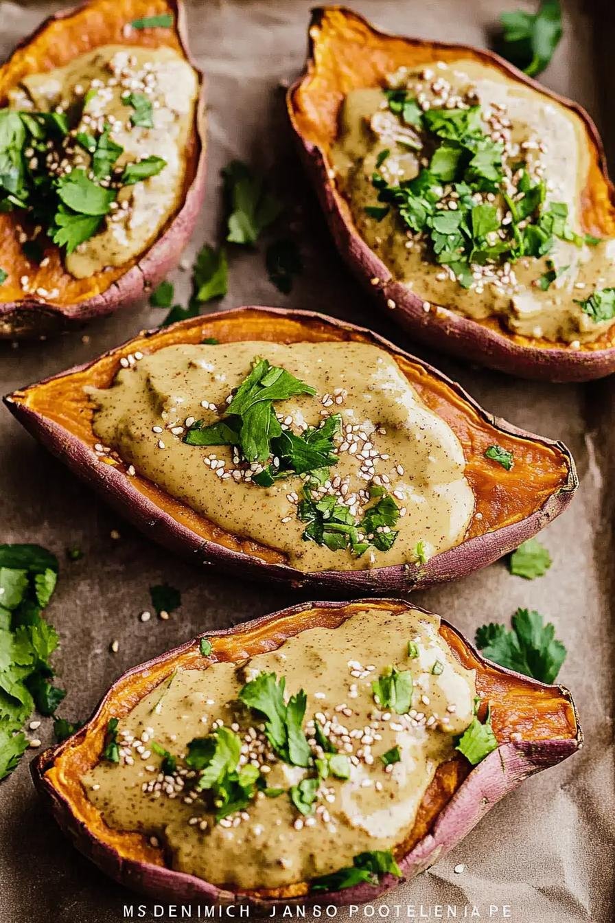Pair Baked Japanese Sweet Potatoes with Miso Tahini Butter alongside a crisp green salad tossed in citrus dressing, or serve them as a vibrant side with grilled tofu steaks. They also shine topped with pickled vegetables or crumbled nori for extra umami crunch.