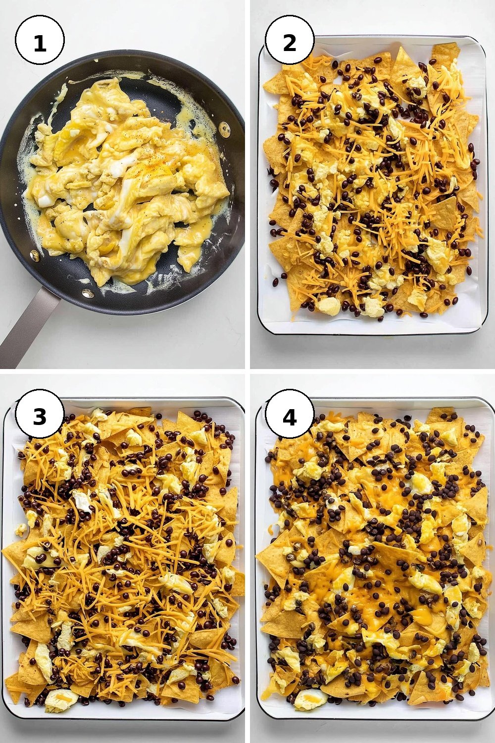 - On a baking sheet lined with parchment, create a layer of tortilla chips, followed by half of the scrambled eggs, black beans, and cheese. Repeat these layers once more.