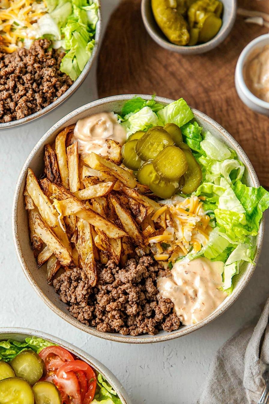- Once the potatoes are ready, divide them among your bowls. Fill the remaining space in each bowl with shredded lettuce, then add the cooked beef mince, cheese, and pickles. Drizzle the burger sauce over the top and serve.
