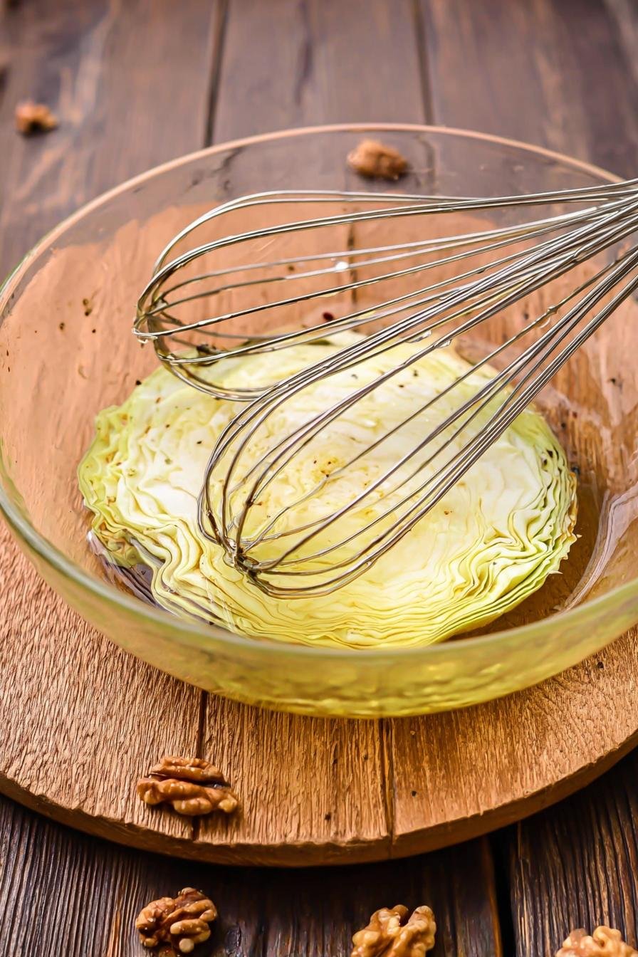 - In a small bowl, whisk together the olive oil, garlic, salt, and pepper. Brush over one side of the cabbage, then flip the cabbage over and brush the other side.