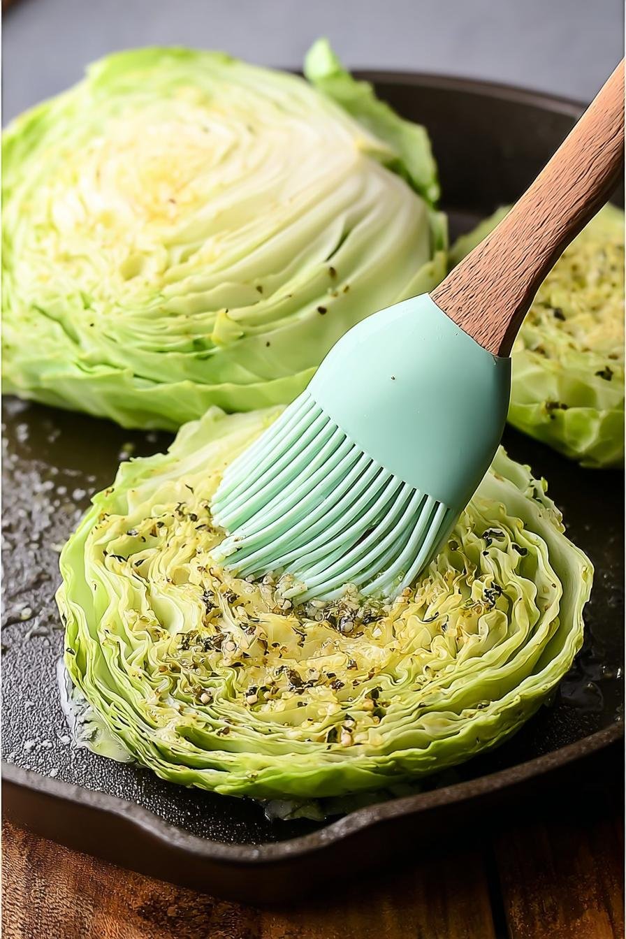 - In a small bowl, whisk together the olive oil, minced garlic, kosher salt, and ground pepper. Brush the mixture generously on both sides of each cabbage steak.