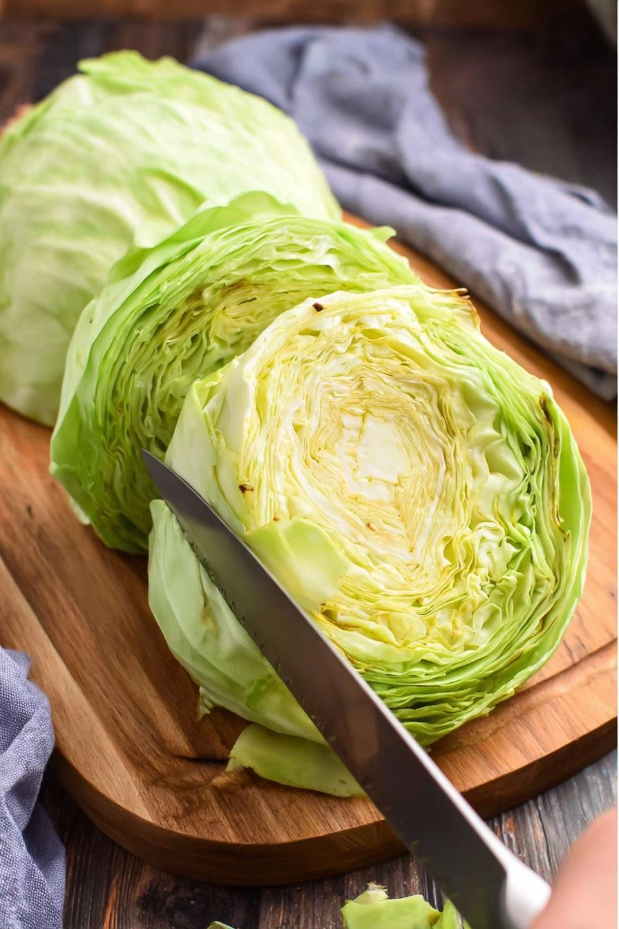 - Cut off the bottom (root) end of the cabbage and place it on a cutting board sitting up so that the flat end is on the cutting board. Cut top to bottom into 3/4- to 1-inch thick slices. Place on the prepared baking sheet.