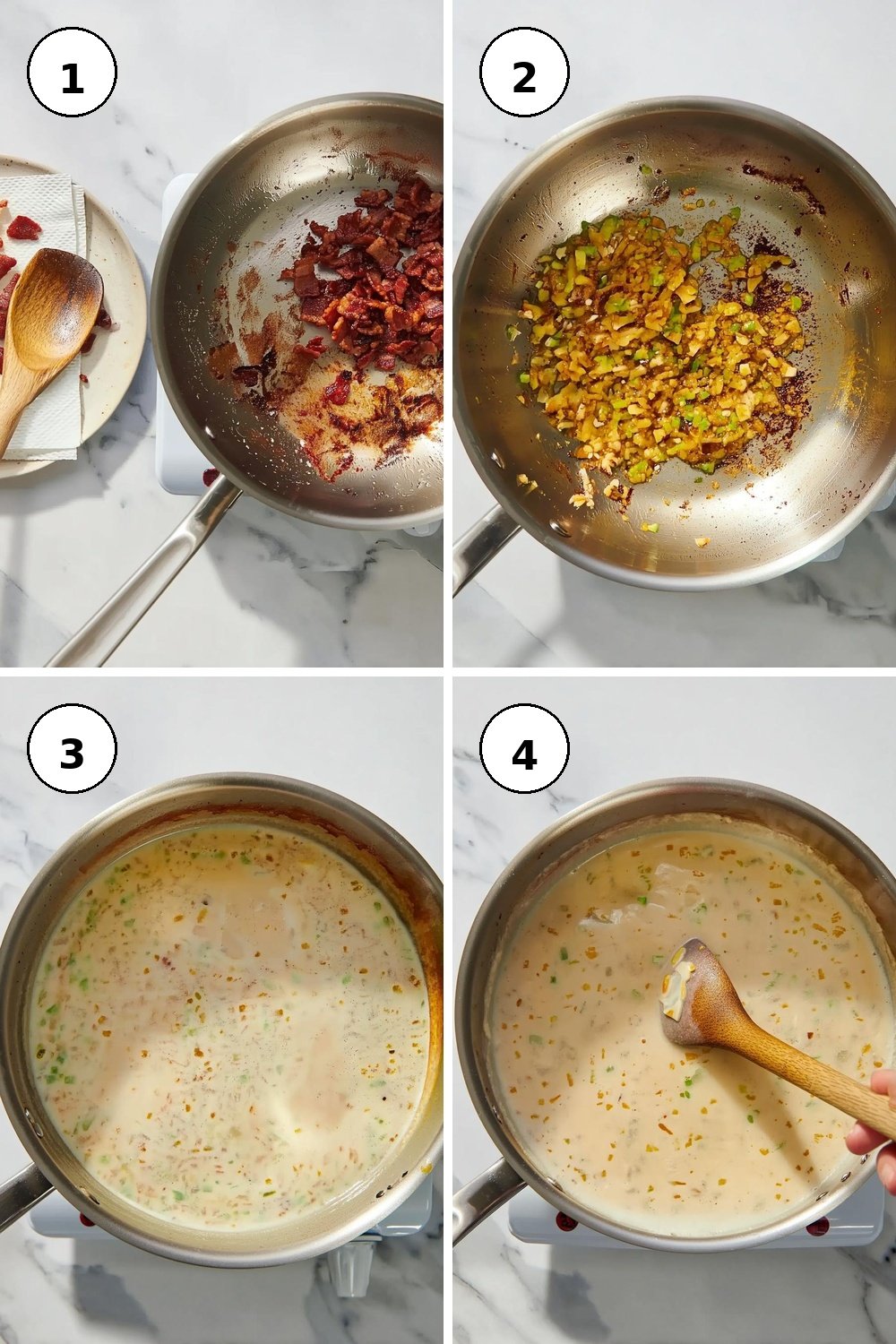 - In a saucepan, cook the bacon over medium heat until it’s nice and crispy, about 5 minutes. Let that delicious aroma waft through your kitchen!