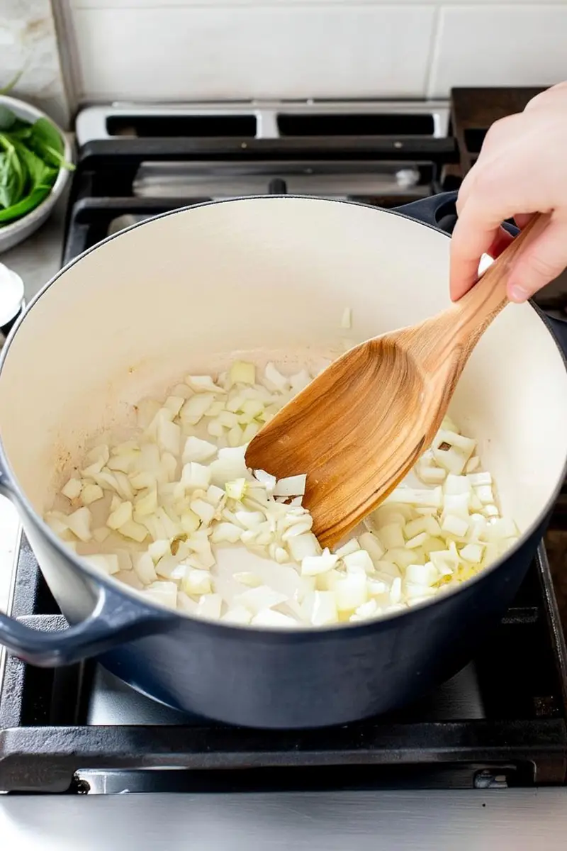 - In a Dutch oven over medium-high heat, heat the oil and sauté diced onions until soft, about 3-4 minutes.