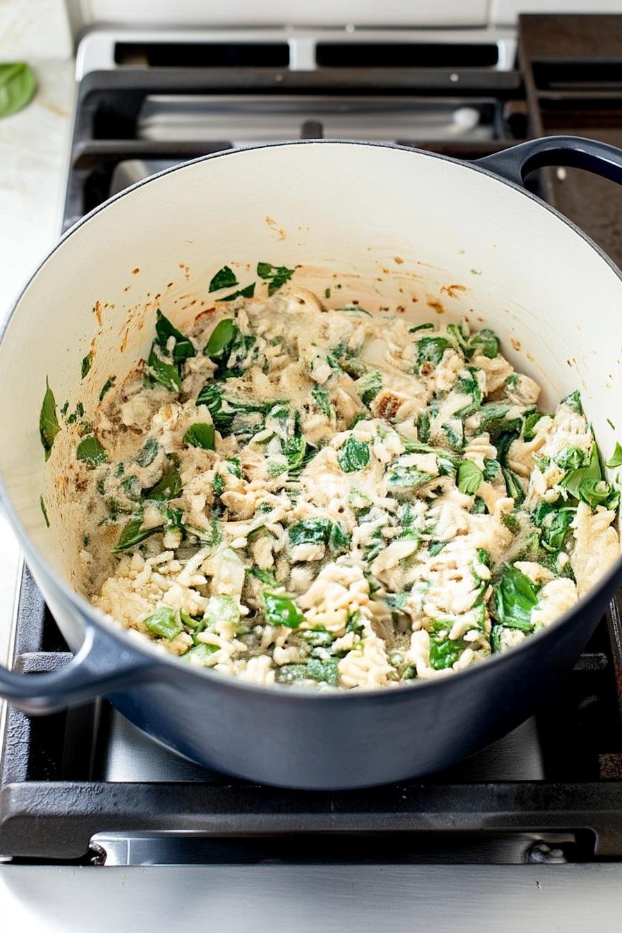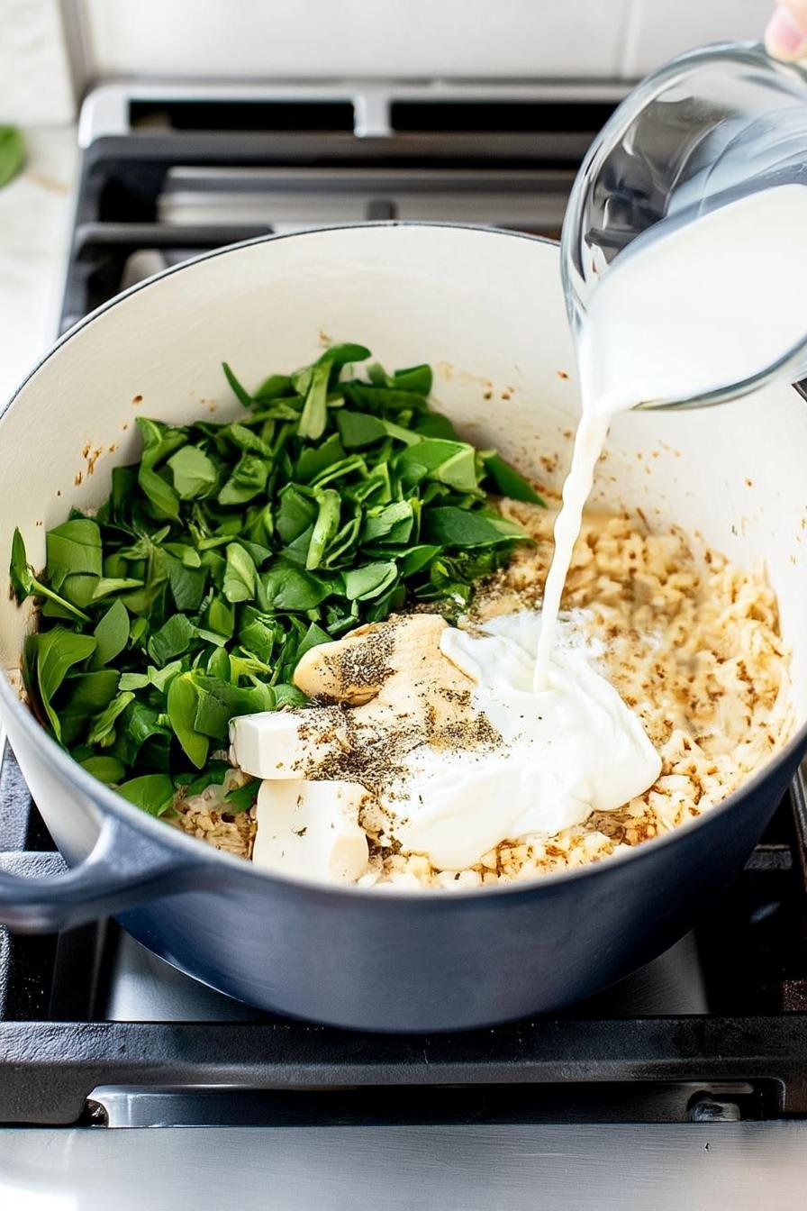 - Lower the heat and mix in milk, garlic powder, Italian seasoning, Dijon mustard, cream cheese, Greek yogurt, and chopped spinach, stirring until combined, about 2-3 minutes.