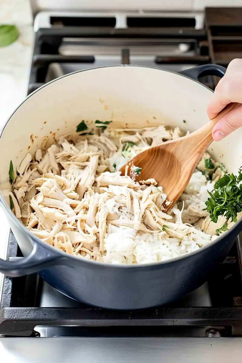 - Gently fold in shredded chicken and cooked rice, ensuring even mixing before transferring to the casserole dish.