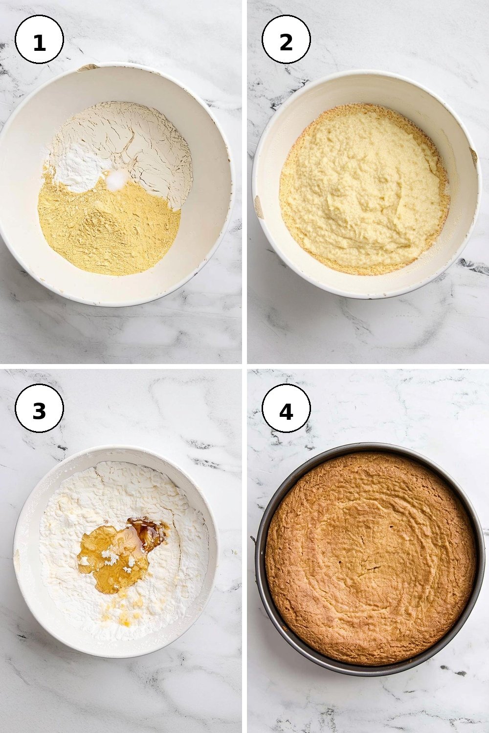 - Combine flour, yellow cornmeal, baking powder, and salt in a large mixing bowl. Whisk to combine.
