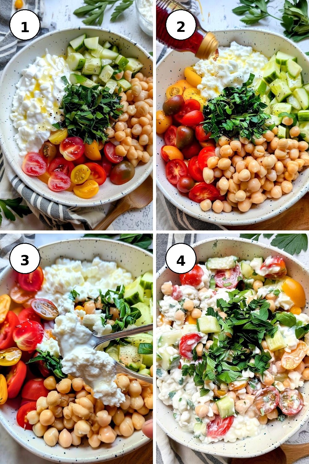 - Prep your ingredients: chop the cucumber and parsley, drain and wash the chickpeas, and halve the tomatoes. Add them to a bowl with the cottage cheese.