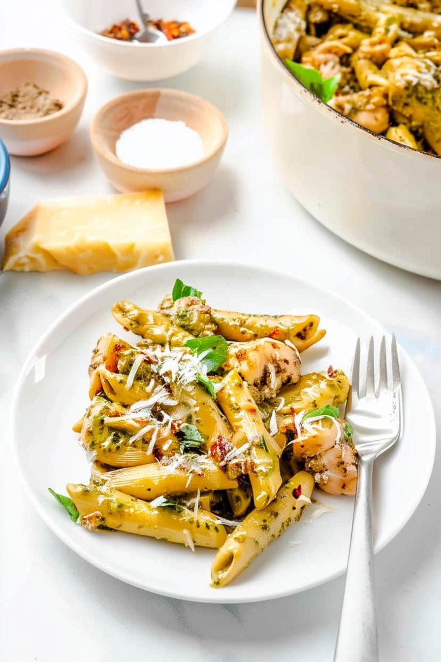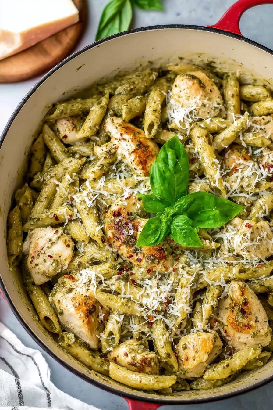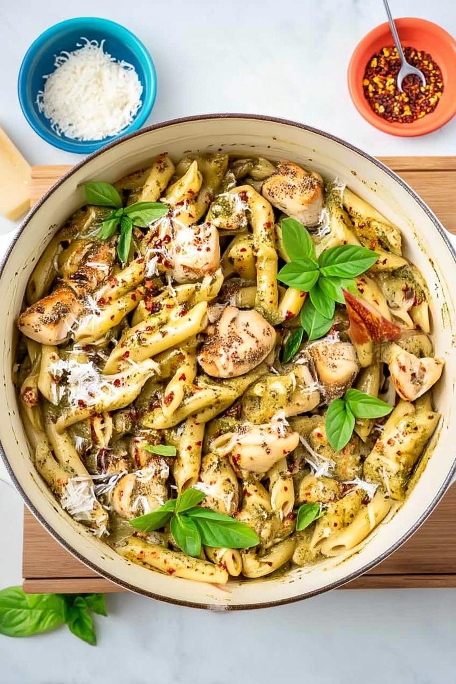 Tender chicken and al dente penne tossed in a luxuriously silky basil pesto cream sauce, ready in just 30 minutes.