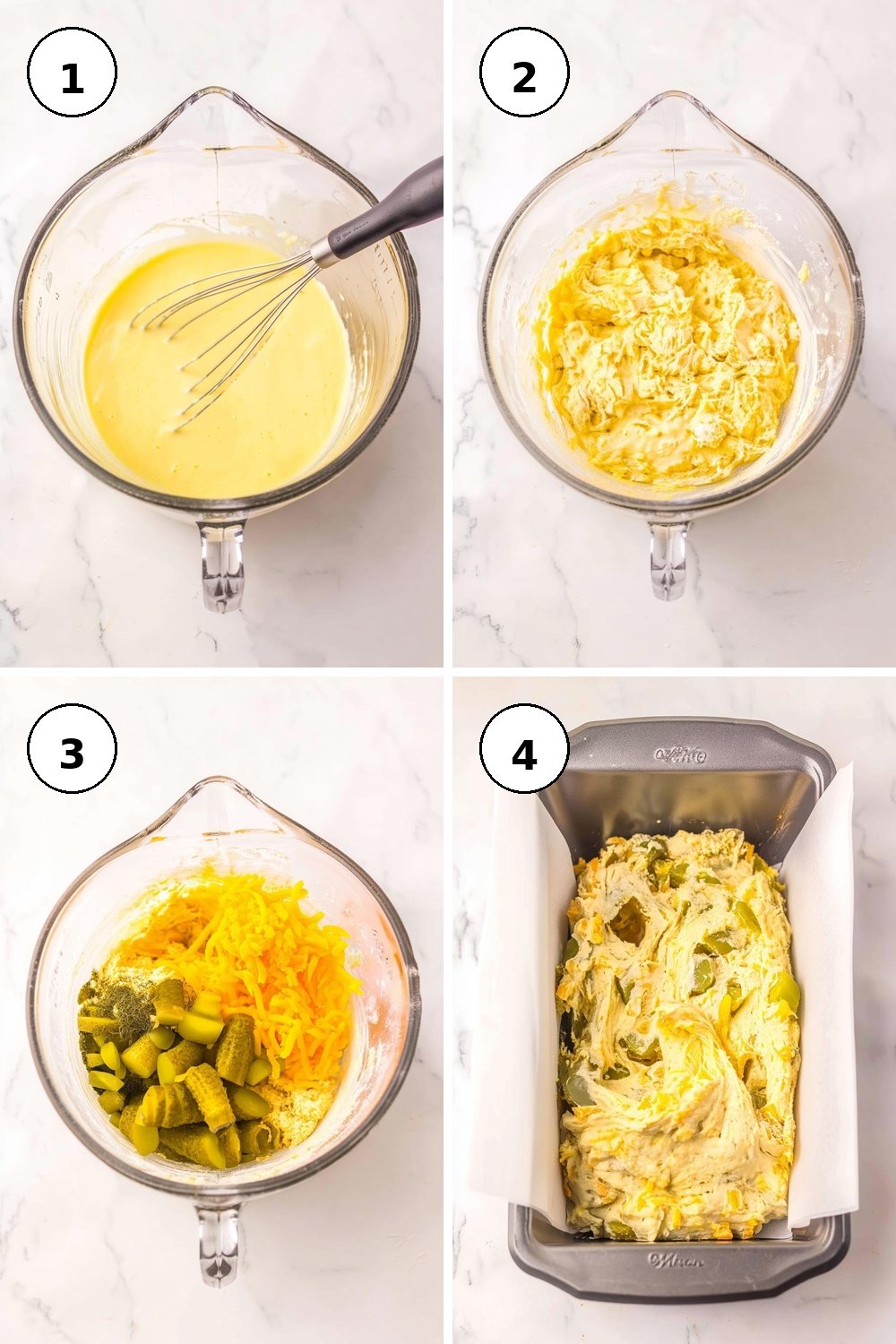 - Gently fold in diced dill pickles, 1/2 cup cheddar, and dried dill so the mix stays airy.