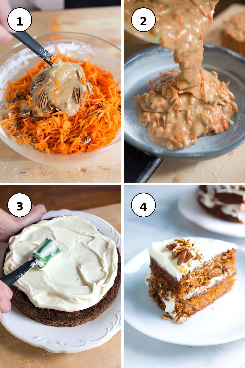 - Gently fold in the grated carrots, chopped pecans, and raisins. Incorporate the dry ingredients until just combined—overmixing can lead to a dense cake.