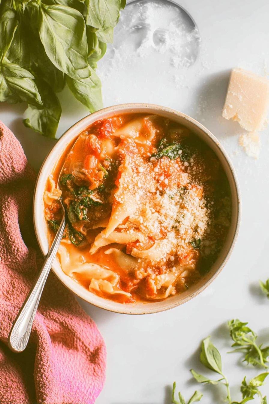 • What’s the best way to reheat leftover lasagna soup? Warm on the stove over medium-low, stirring, and add a splash of broth or water if it’s too thick.