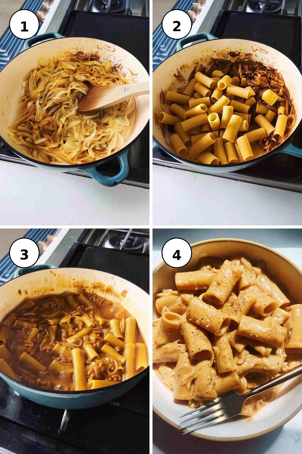 - Add rigatoni, Worcestershire sauce, and beef broth and stir everything together. Carefully submerge the noodles and cook over a medium simmer for 20 minutes with the lid on, occasionally removing it and stirring so the noodles don’t stick to the pot.
