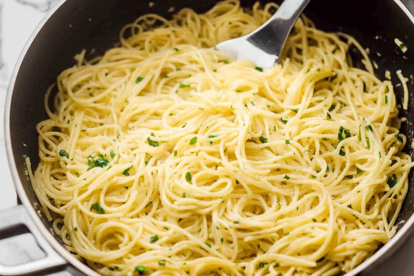 - Add drained spaghetti to the skillet and toss to coat with butter.
