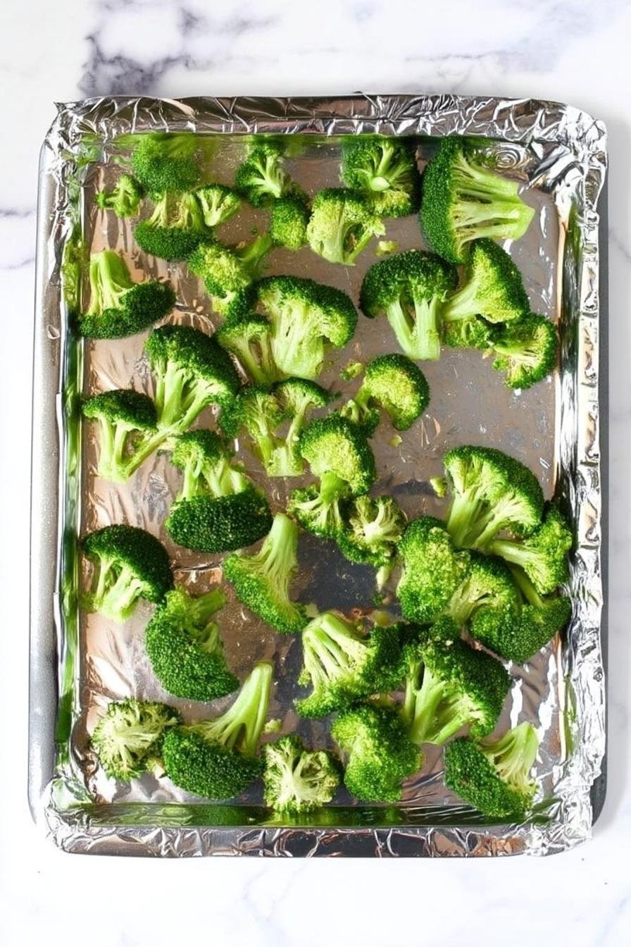 - Toss the broccoli in the olive oil mixture until each piece is nicely coated. Spread them onto the baking sheet for even roasting.