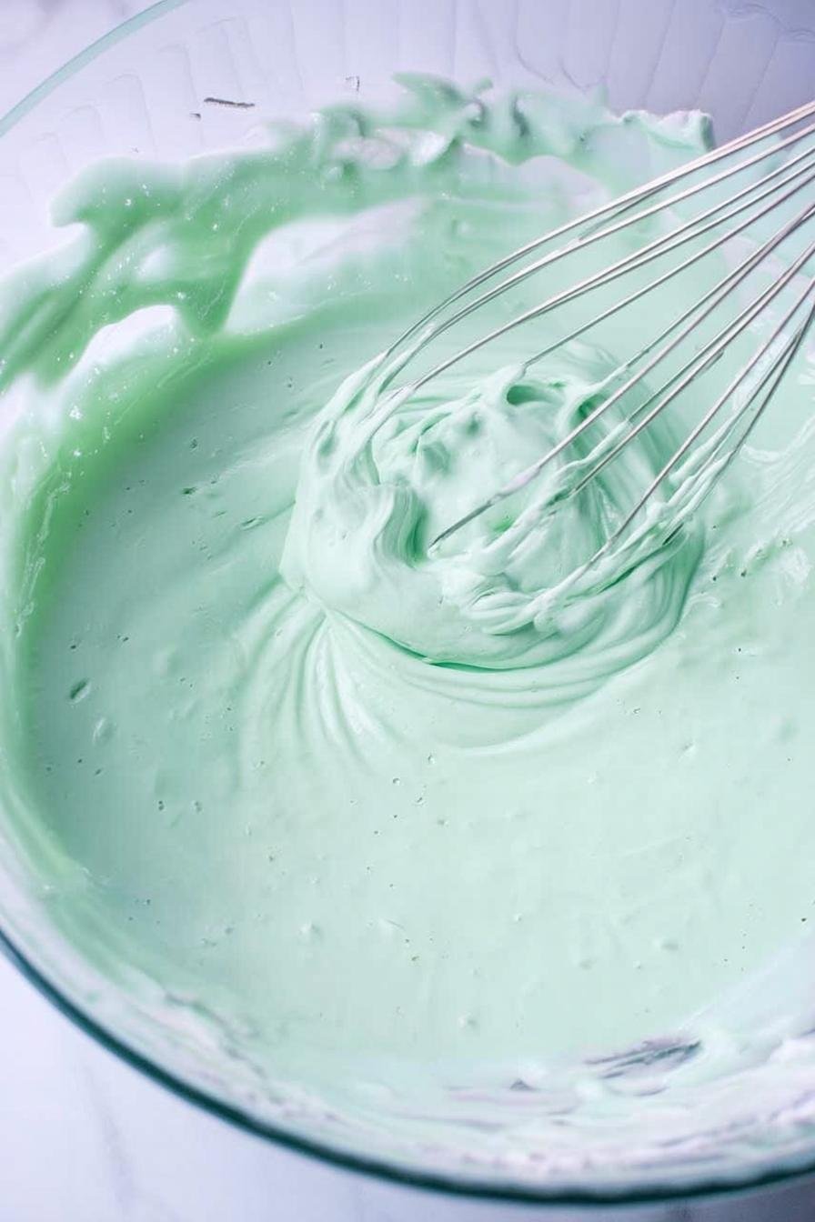 - Once melted, whisk in the creme de menthe, creating a mix of refreshing aroma and warm color.