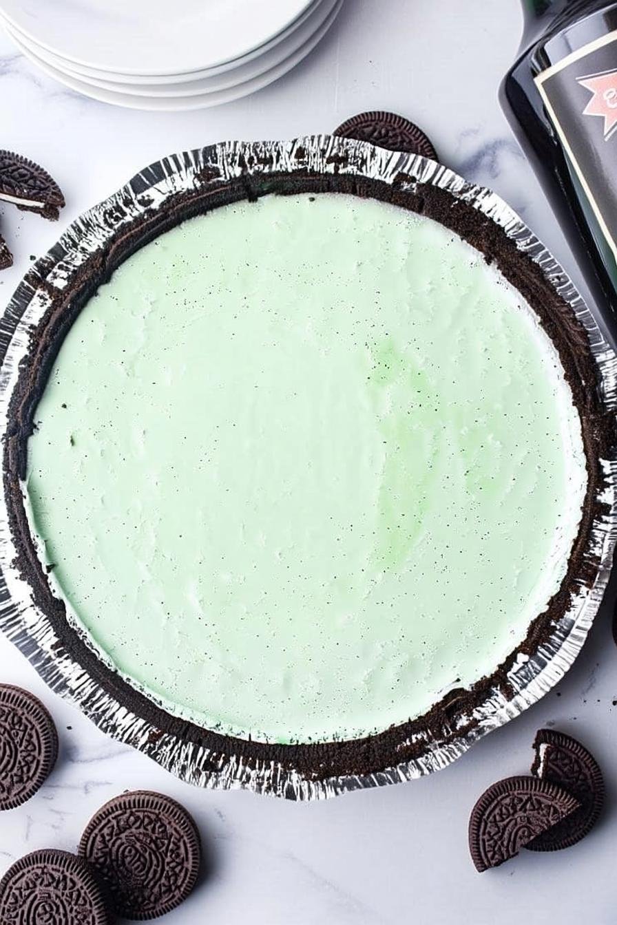 - Pour the filling into the prepared Oreo crust, smoothing it to ensure an even surface. Freeze the pie for 6-8 hours or overnight until set.