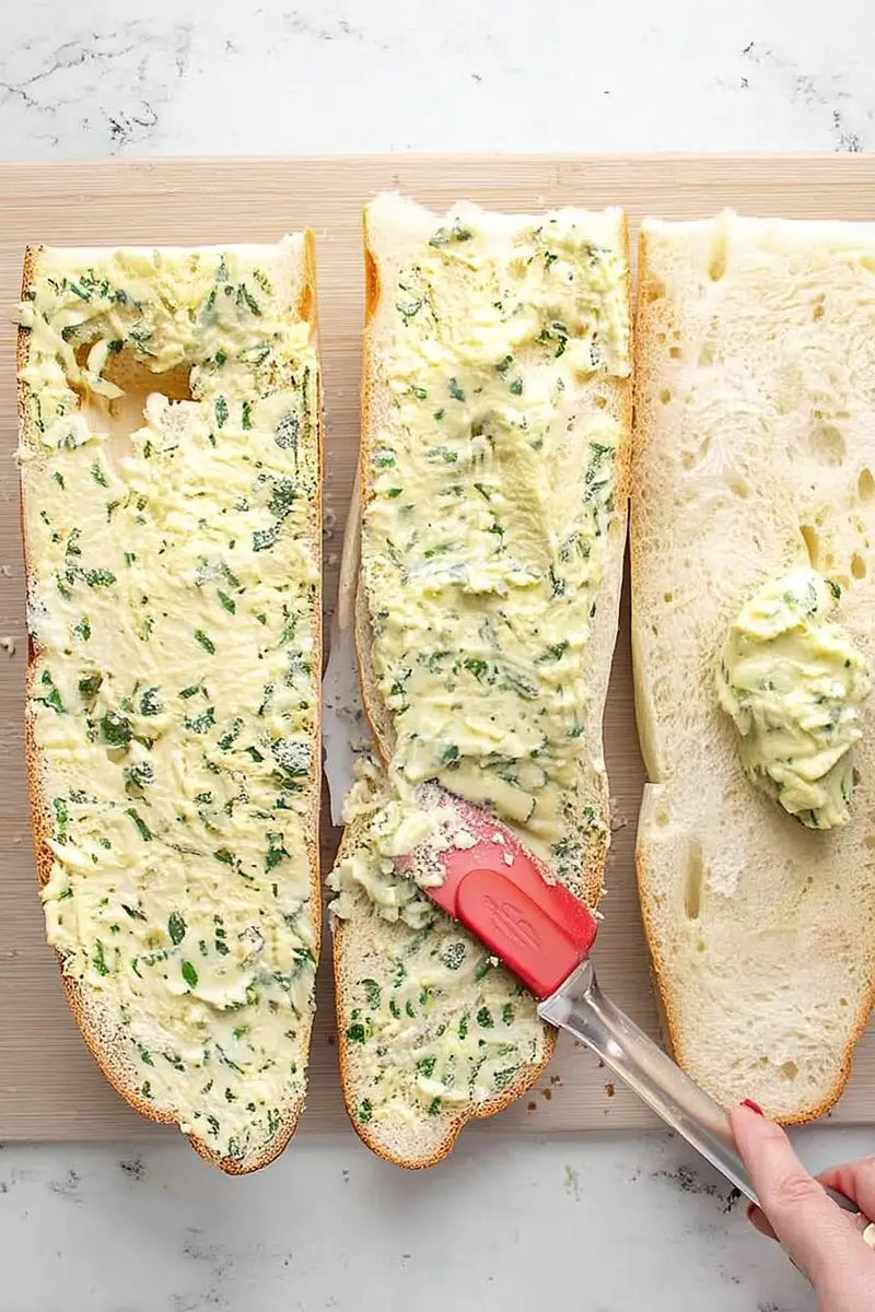- Slice the loaf in half lengthwise, laying the pieces on a baking sheet cut-side up. Generously spread that delicious garlic butter mixture over both halves.