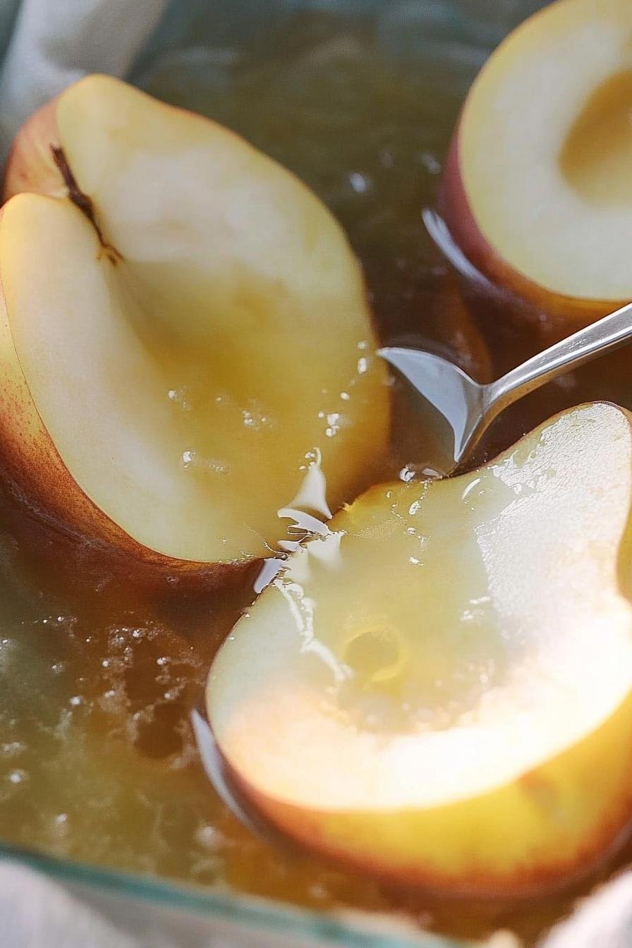 - In a small bowl, whisk together 2 tablespoons melted butter, 3 tablespoons honey, and 1 teaspoon vanilla extract until smooth, then drizzle the mixture evenly over pear halves.