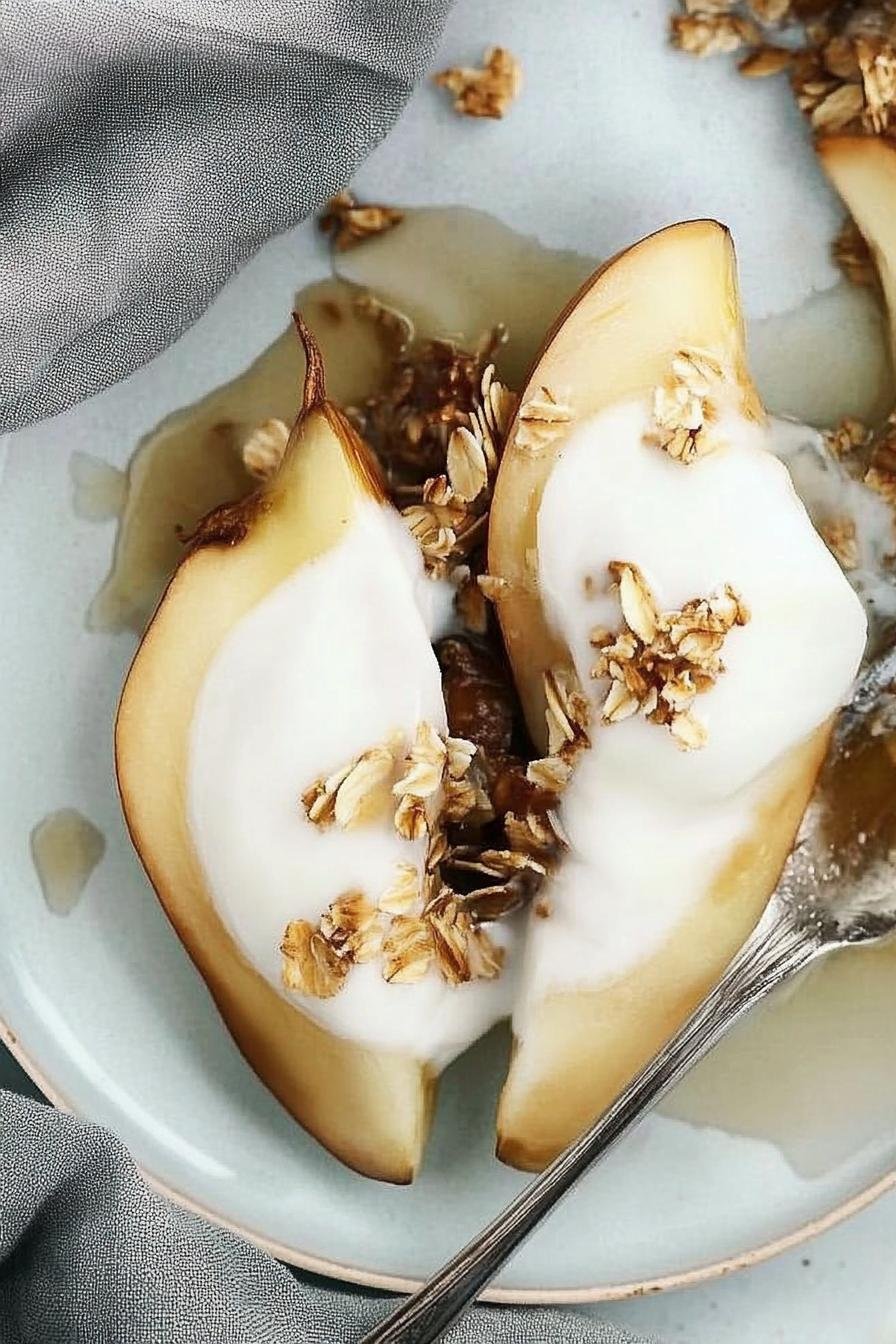 - What can I serve with baked pears? Try vanilla ice cream, Greek yogurt, sweet ricotta, or a drizzle of heavy cream for a delightful contrast.