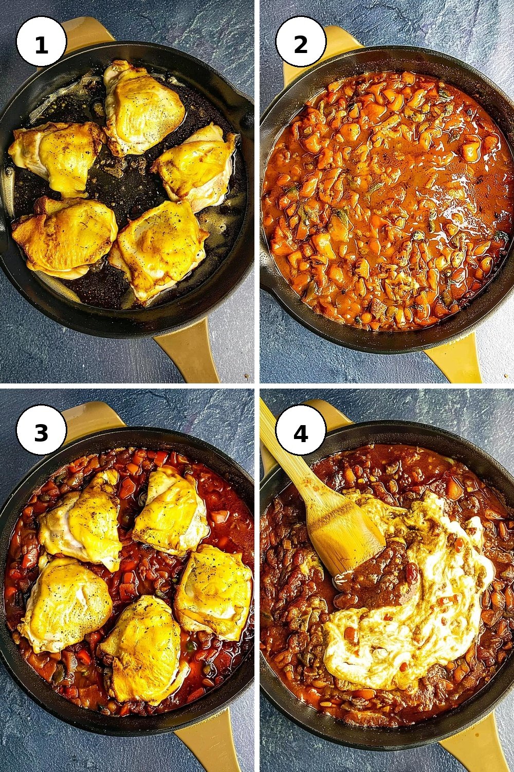 - Remove from heat and take out the chicken pieces. Swirl in the sour cream gradually to avoid curdling, adjusting the seasoning as needed.