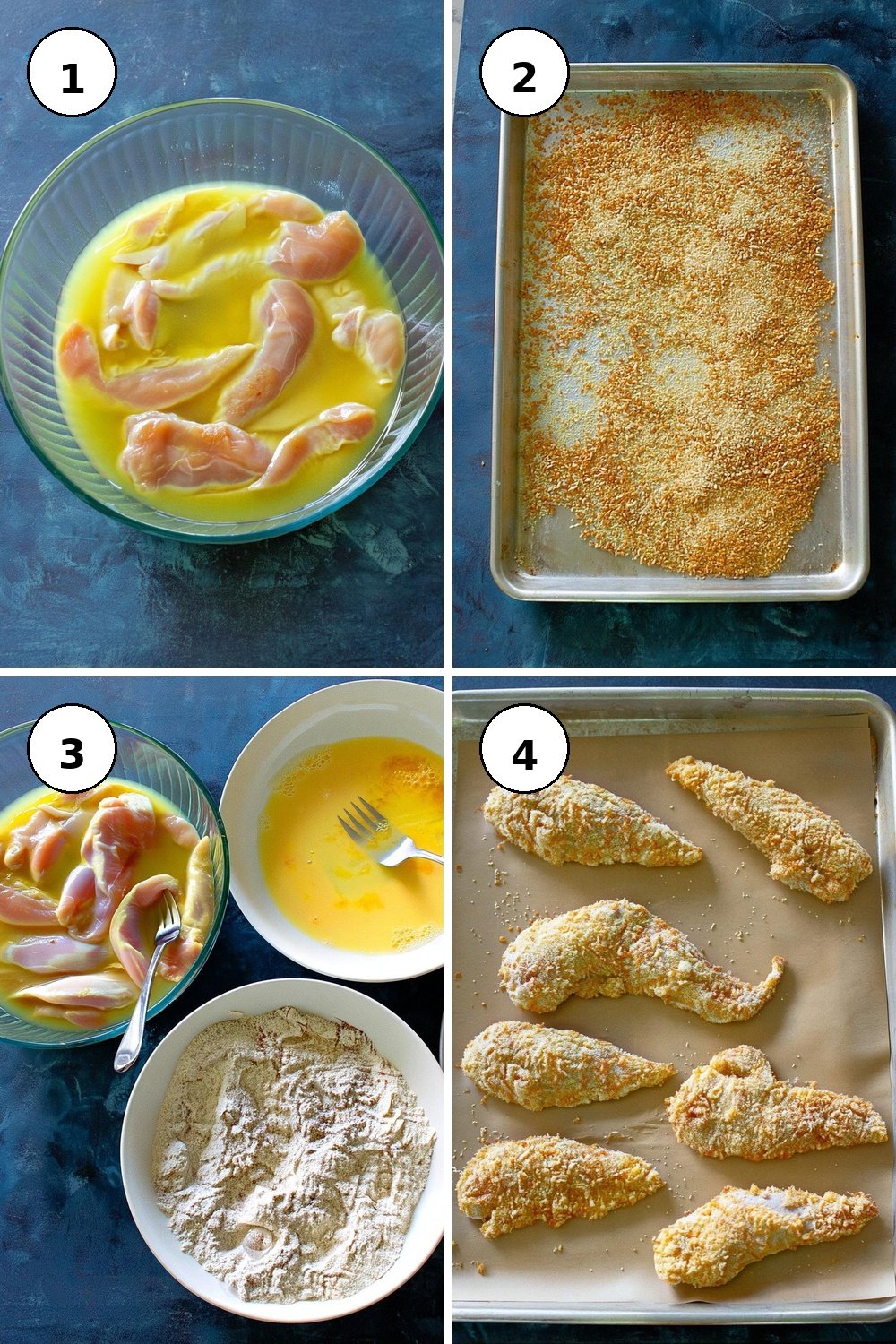 - Take chicken out of the marinade, coat in the flour mixture, then dip in the egg mixture, then coat in the breadcrumbs. Place on baking sheet.