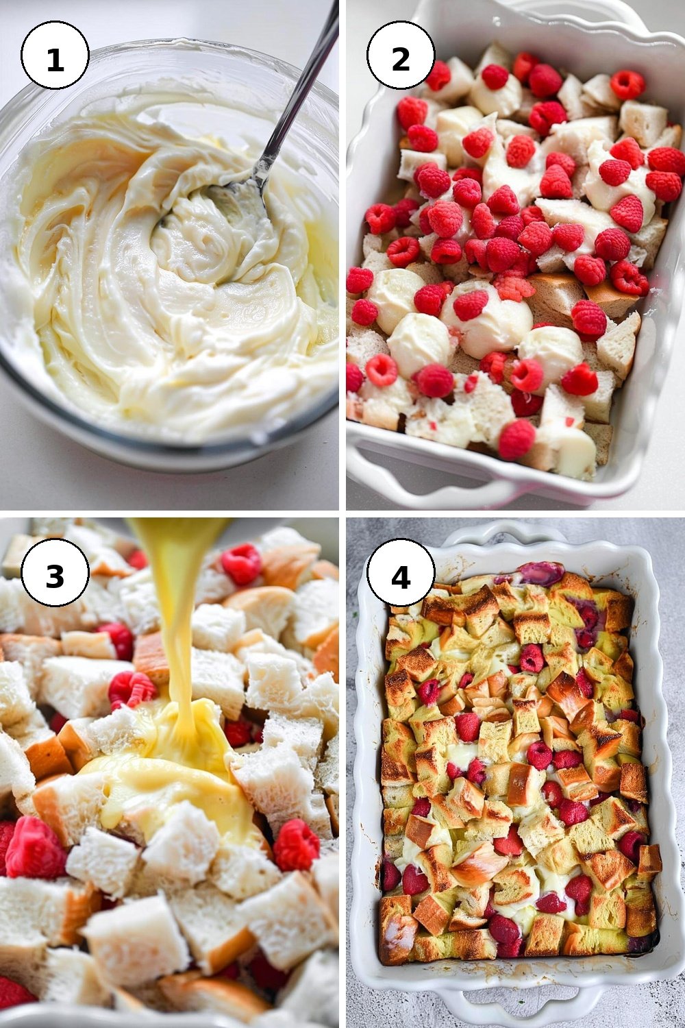 - Layer the raspberries on top, followed by the remaining bread cubes, creating a delightful mountain of flavor.