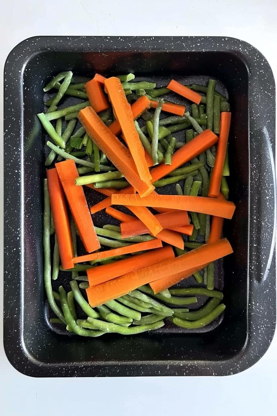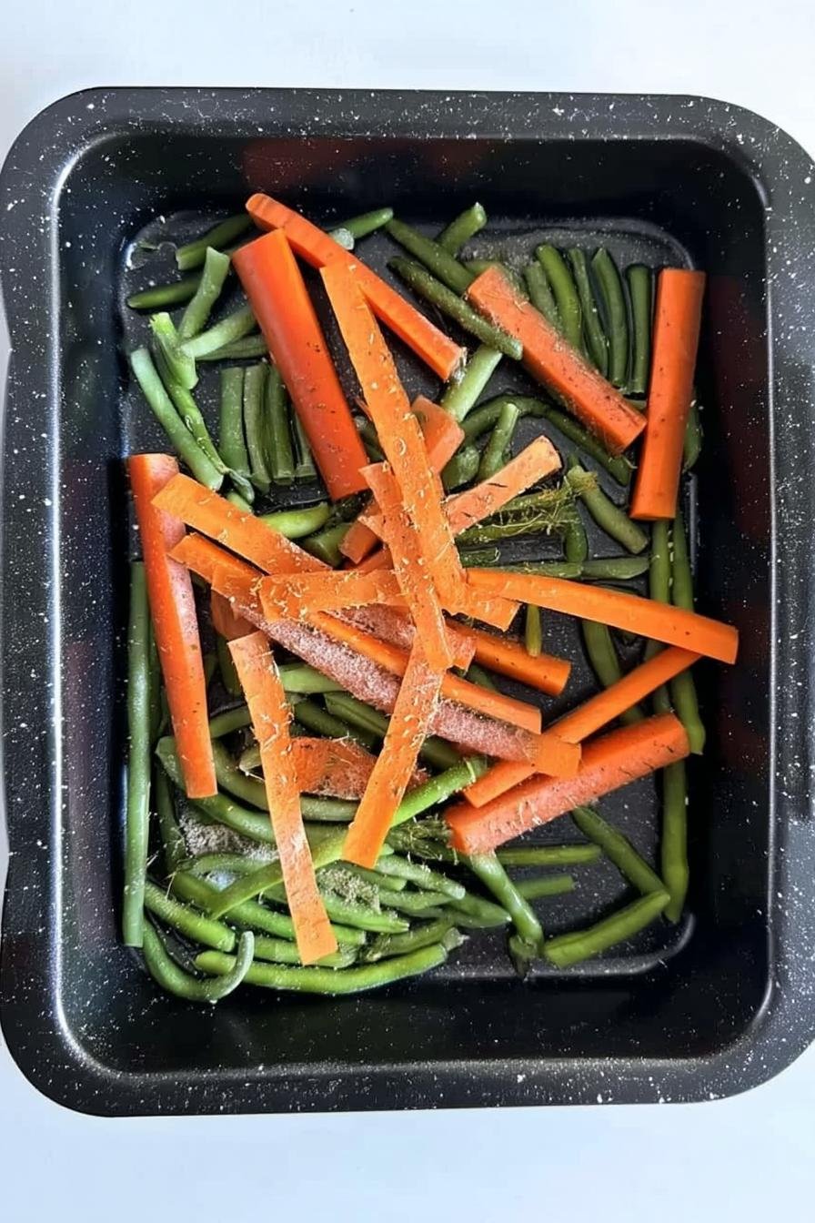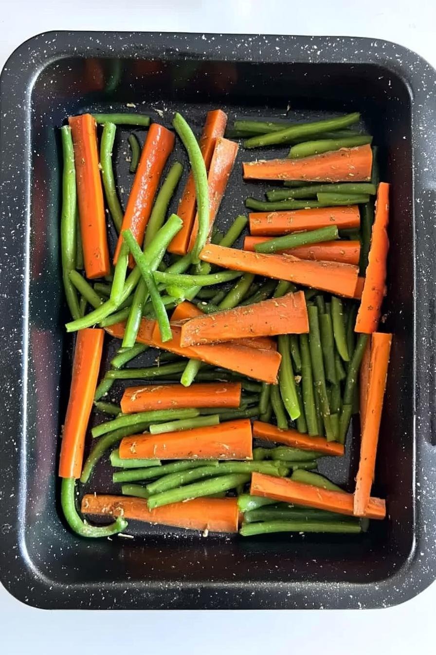 - Place the carrots and green beans into a baking tray. Drizzle with olive oil, dried rosemary, thyme, garlic powder, salt, and pepper; mix well until everything is coated.