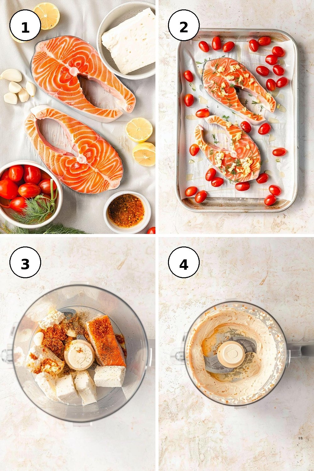 - Season the salmon steaks & tomatoes with minced garlic, salt, pepper, lemon zest, dill, and olive oil.