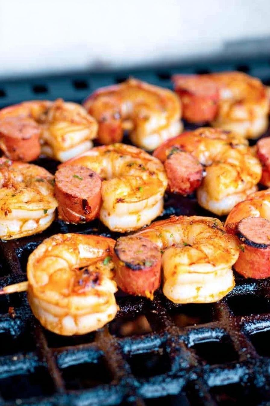 - Grill the skewers over medium-high heat for roughly 3 minutes on each side until the shrimp turns opaque and the sausage is heated through. Serve immediately and enjoy!