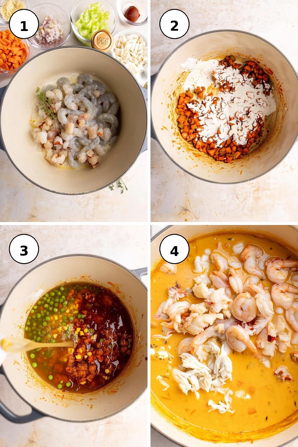 - In a large pot over medium-low heat, add 3 tbsp of butter. Once hot, toss in the shrimp and lobster meat. Cook for 3–4 minutes, then remove and set aside.