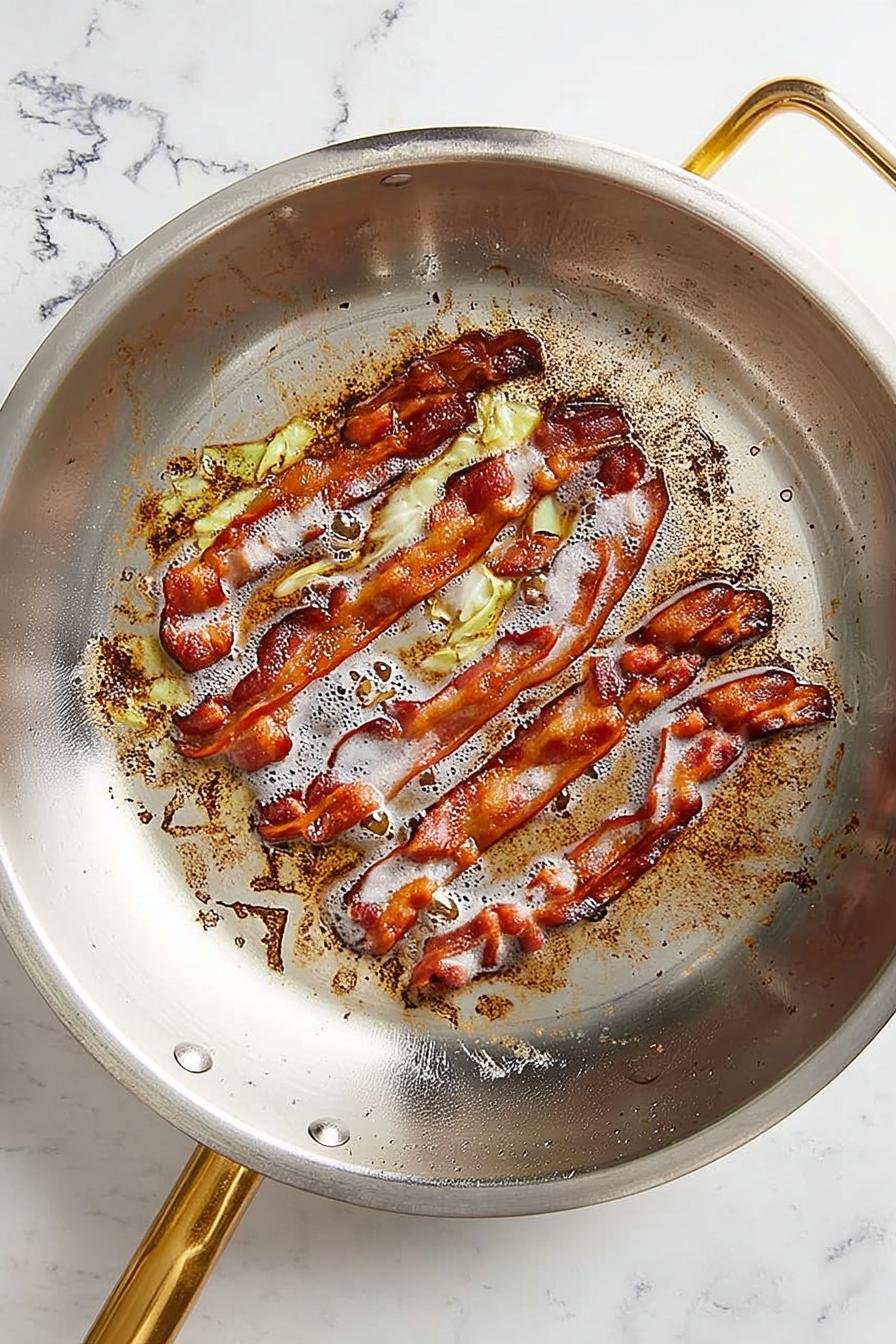 - Begin by cooking the bacon in a large skillet over medium heat until crispy. Allow the aroma to fill your kitchen; this might take about 5 to 7 minutes.
