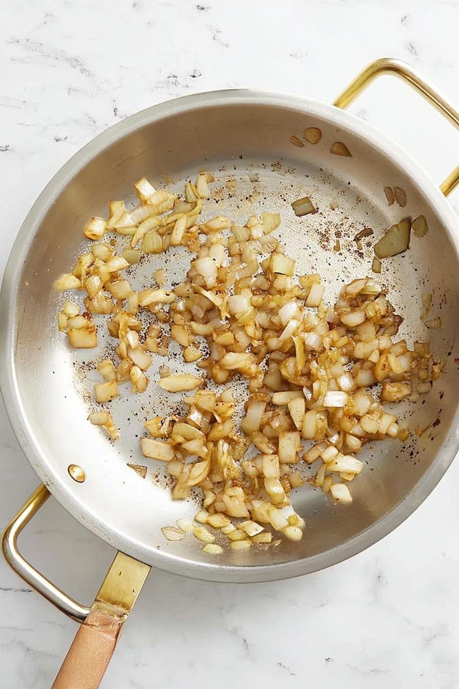 - After removing the bacon from the skillet, add the diced onion and continue to sauté over medium heat until the onions become soft and translucent, about 5 minutes.