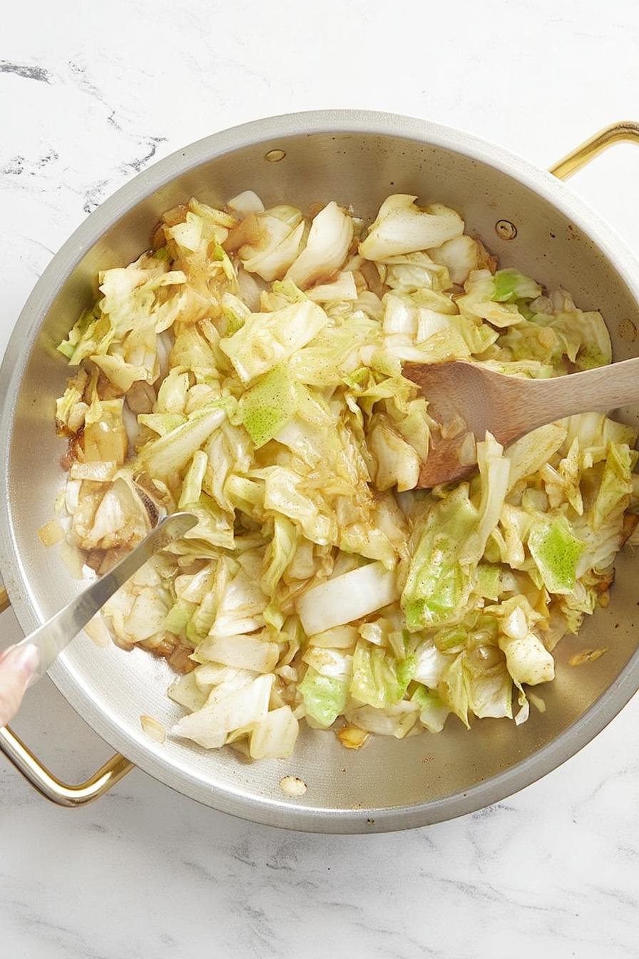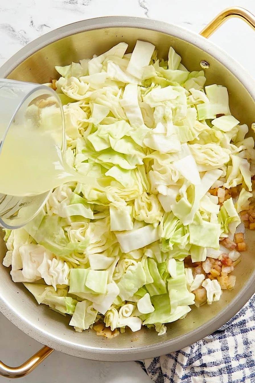- Once the onions are soft, add the chopped cabbage and chicken broth. Continue to let the cabbage cook over medium, stirring occasionally, until it has softened, most of the liquid has evaporated, and the edges begin to brown.