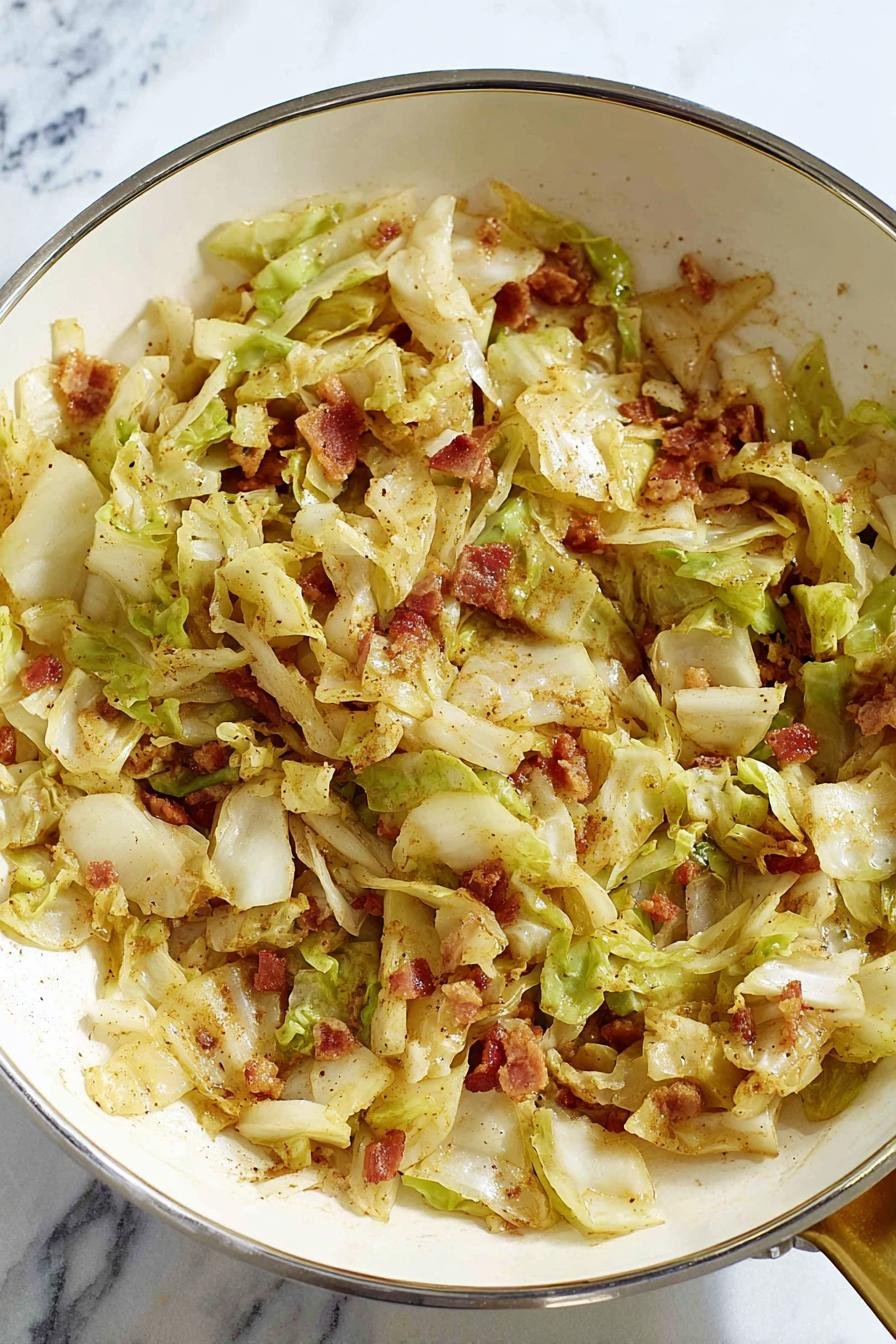 - Finally, crumble the cooked bacon and stir it back into the cabbage. Give the cabbage a taste and adjust to your liking.