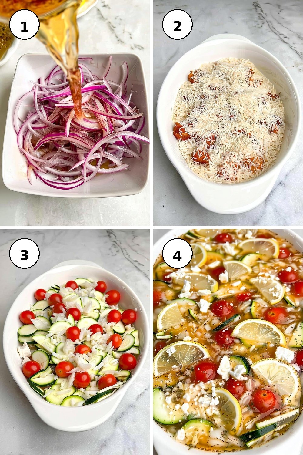 - In a large baking dish, combine the diced chicken, zucchini, onion, and grape tomatoes, ensuring everything is evenly distributed.