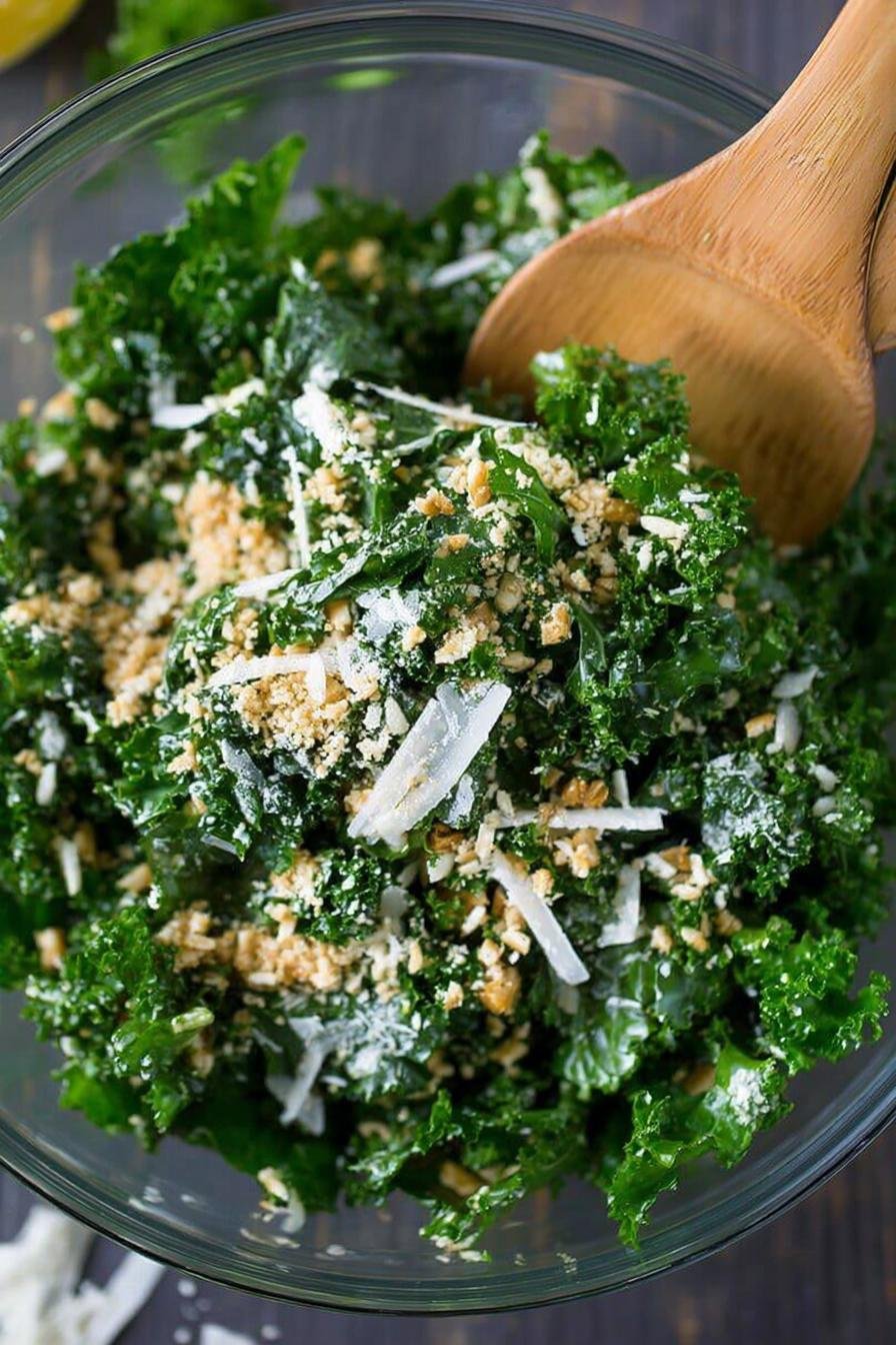 - Toss the kale with the remaining dressing, then sprinkle with parmesan cheese and croutons just before serving for maximum crunch.