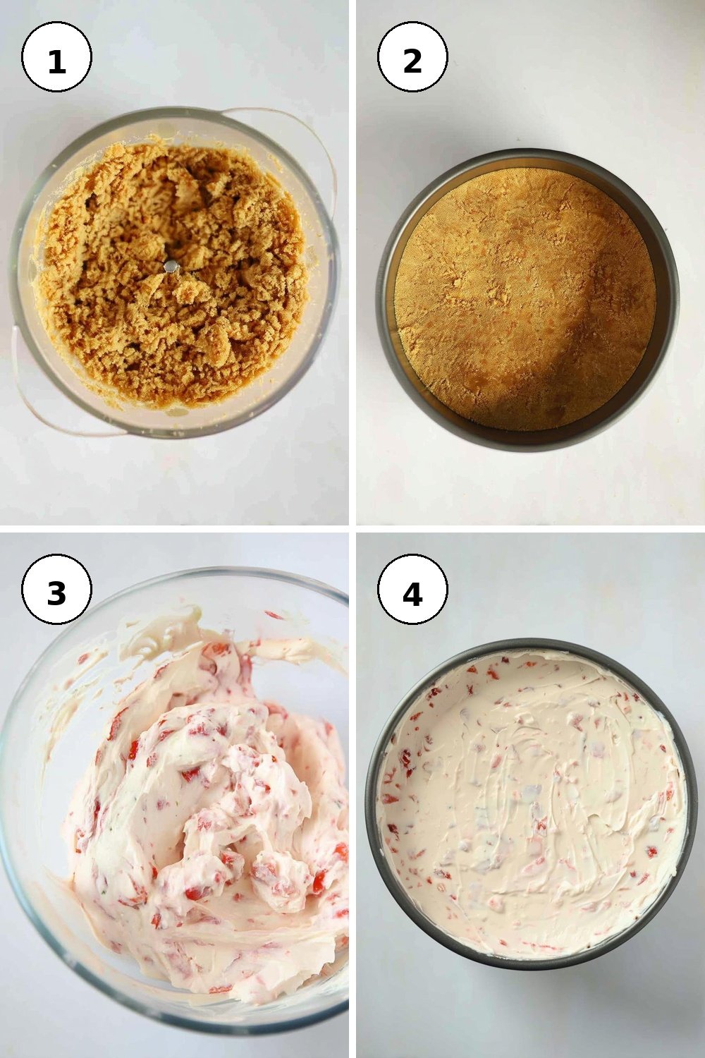 - Combine 200 g of crushed digestive biscuits with 80 g of melted unsalted butter and press the mixture evenly into a tin. Chill this in the fridge while preparing the filling.