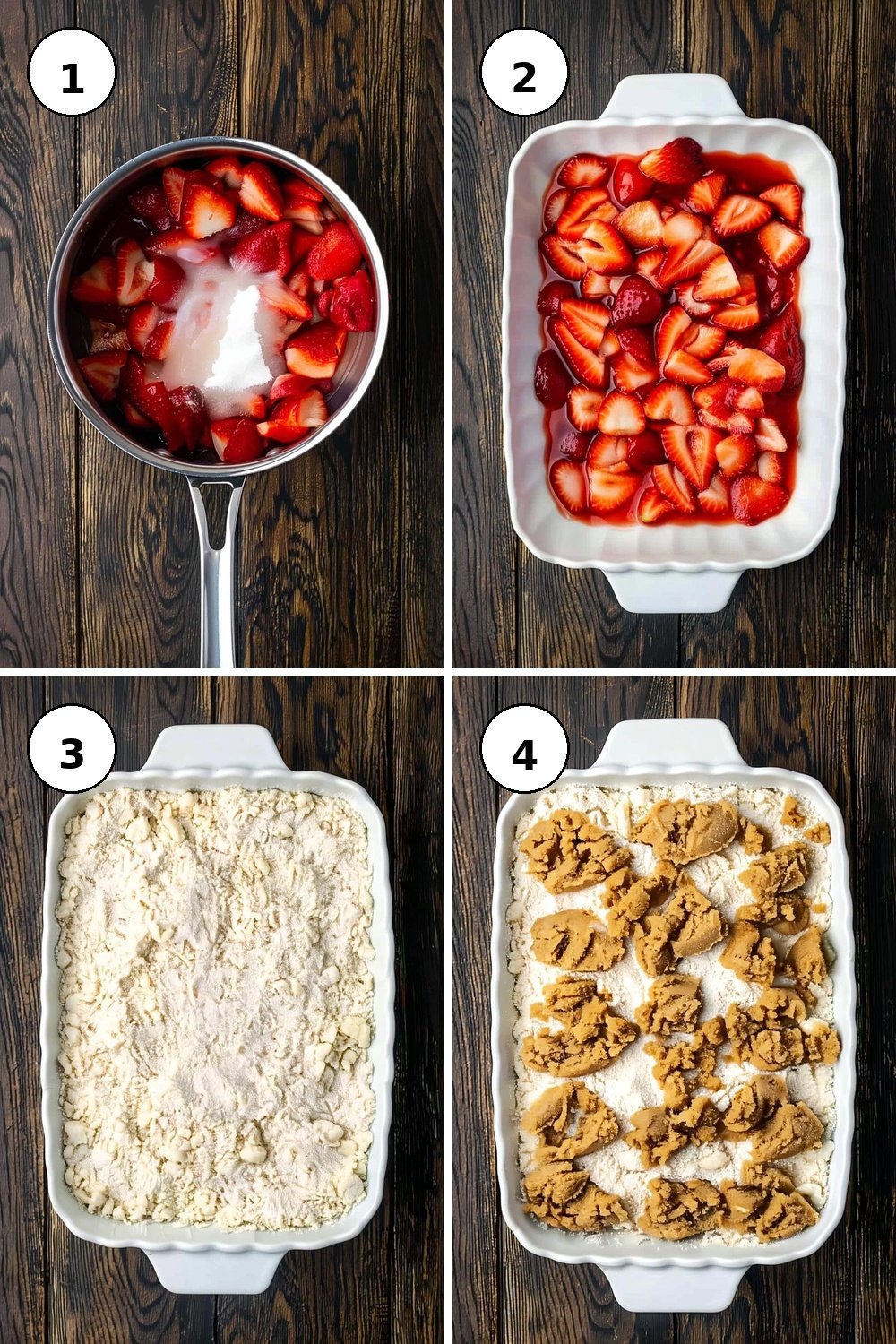 - Pour the batter into a baking dish. Spoon the strawberries with their juices over the batter, ensuring even coverage without stirring them in.