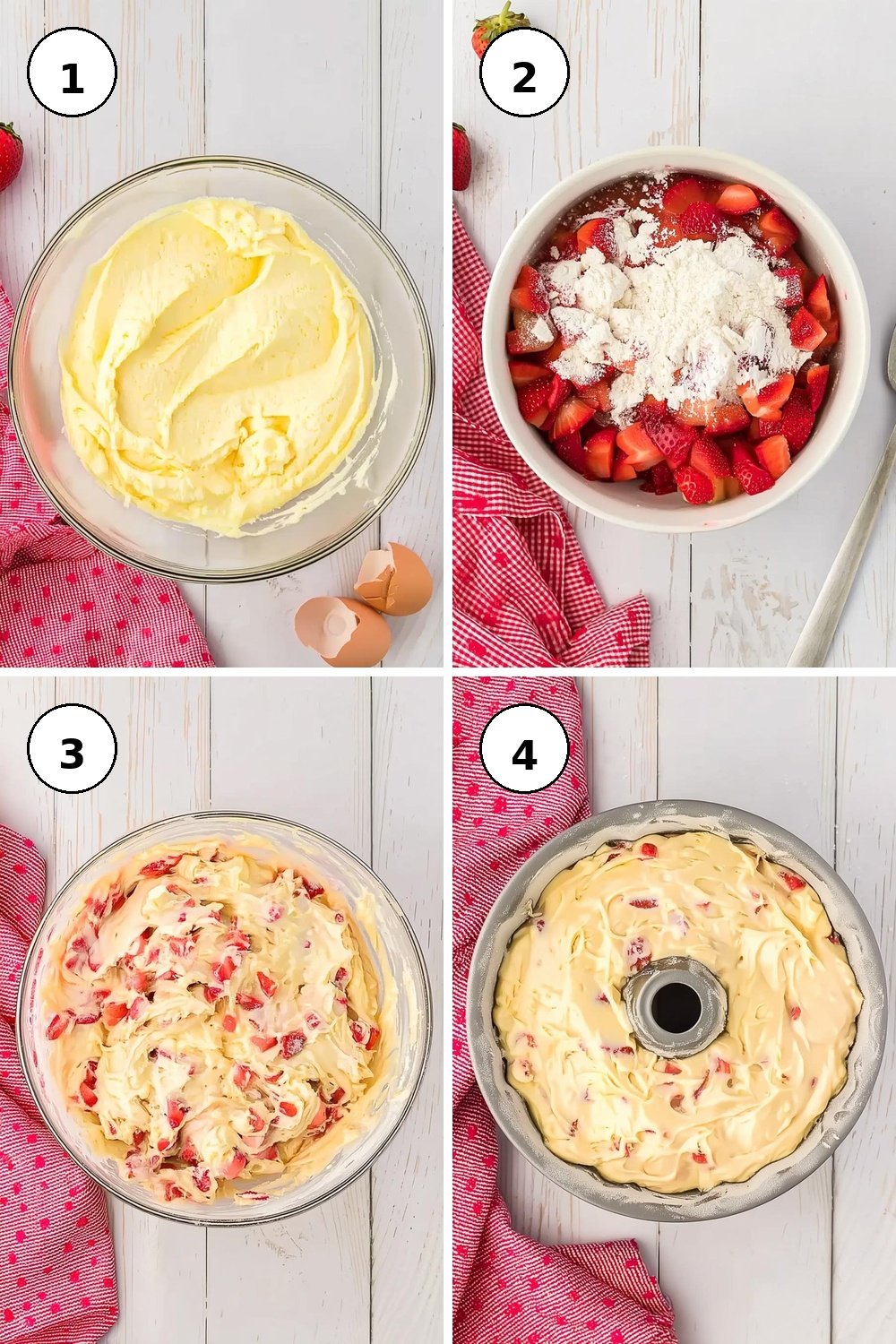 - Gently fold in the flour and fresh strawberries until just combined. Avoid overmixing; you want it light and airy.
