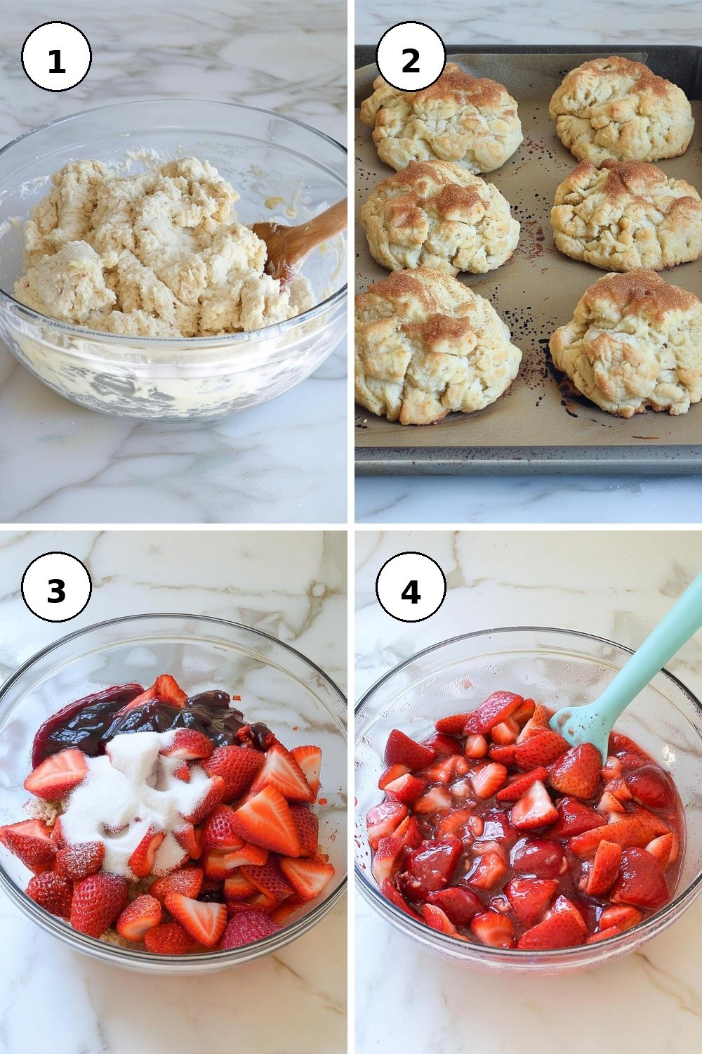 - While the biscuits bake, prepare the strawberry filling: Mash a third of the hulled berries until chunky, then mix in the rest along with jam and sugar. Allow this to sit for about 10 minutes.