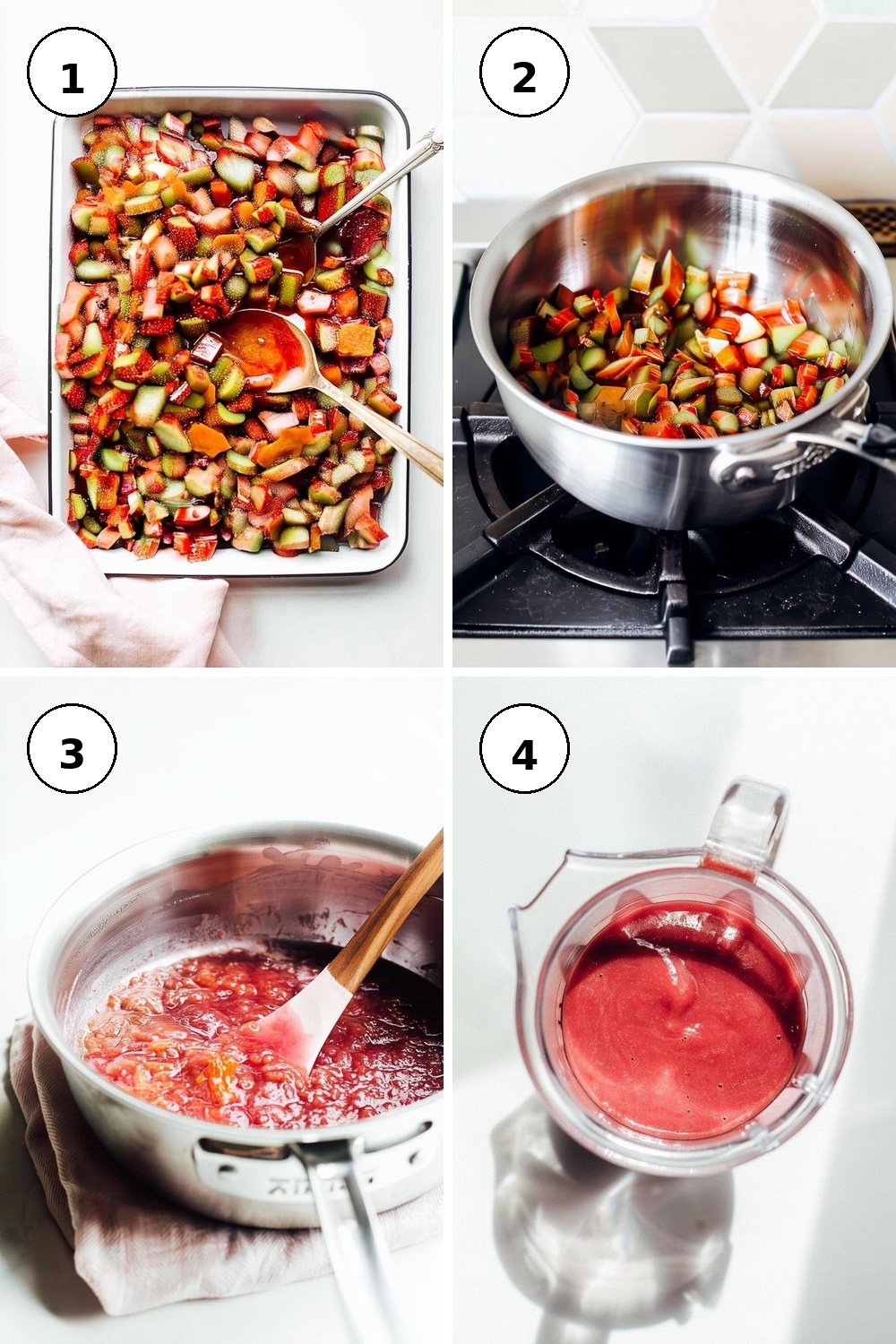 - Transfer the mixture to a medium pot. Gently simmer for about 10 minutes with the lid on. Stir occasionally; the sound of bubbling rhubarb can be quite soothing as it softens and starts breaking down.