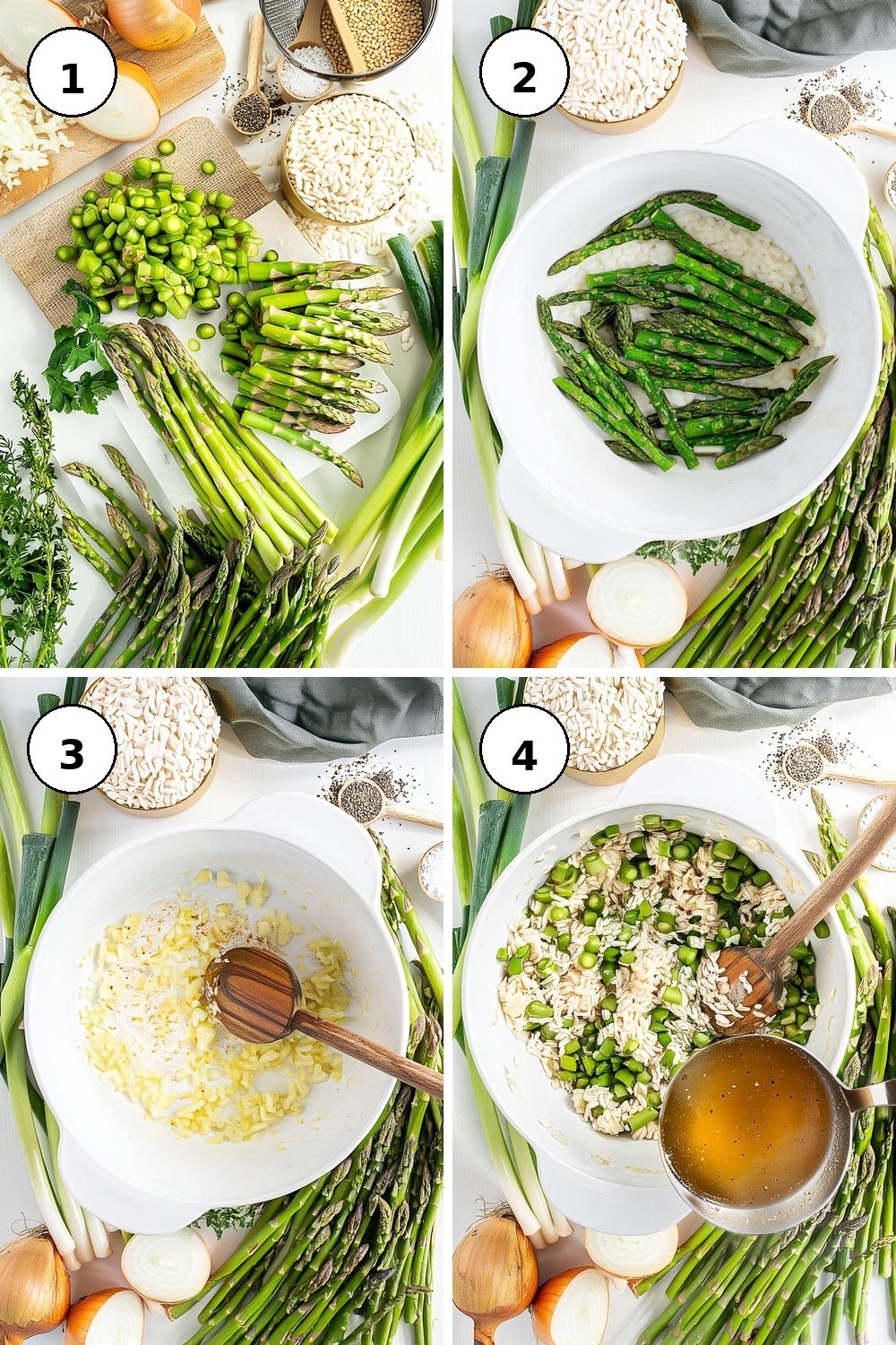 - Add the chopped asparagus stems and begin to add the warm vegetable broth, one or two ladles at a time, stirring frequently. Wait for the rice to absorb most of the liquid before adding more broth, cooking for about 20 minutes total.